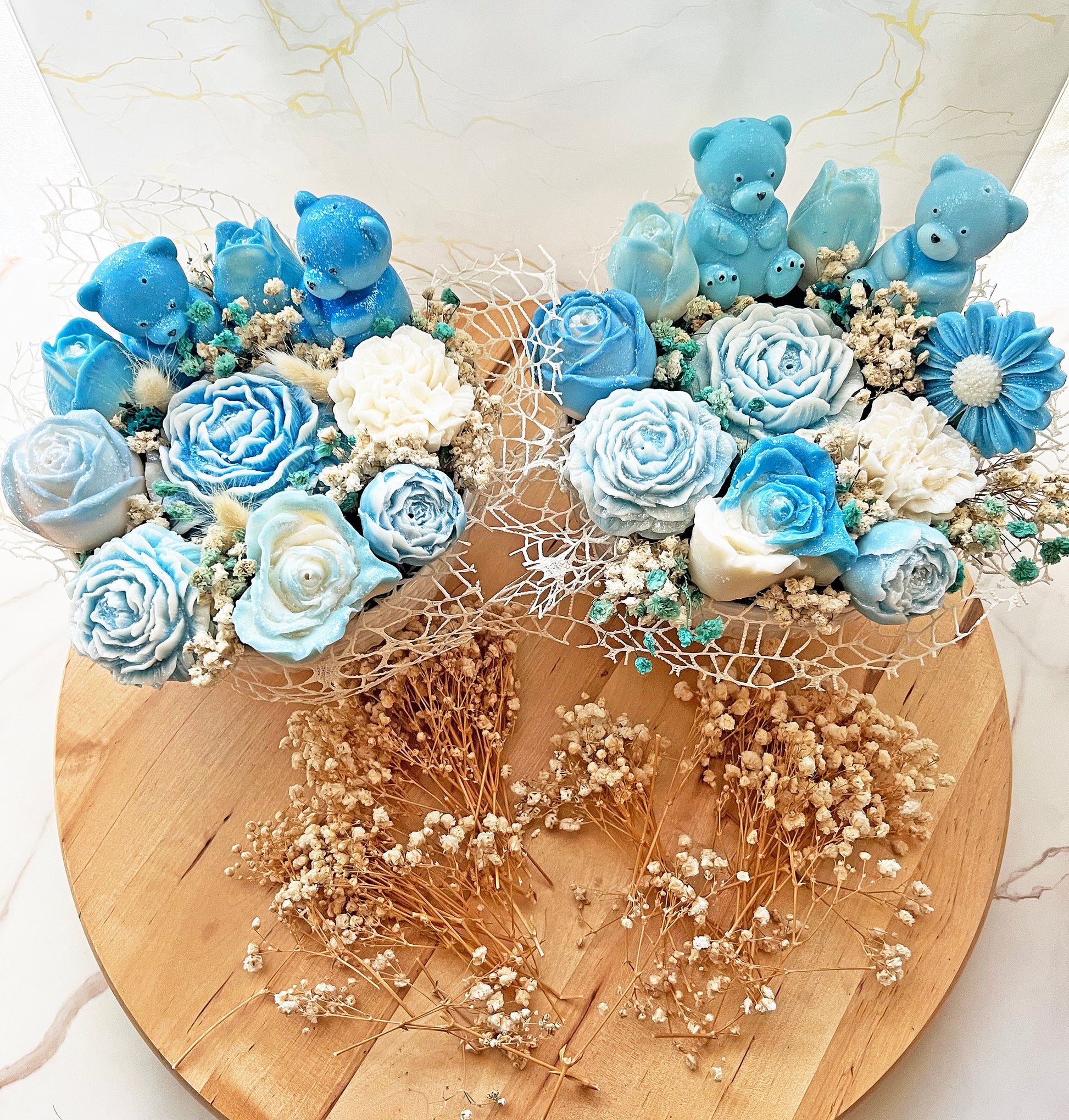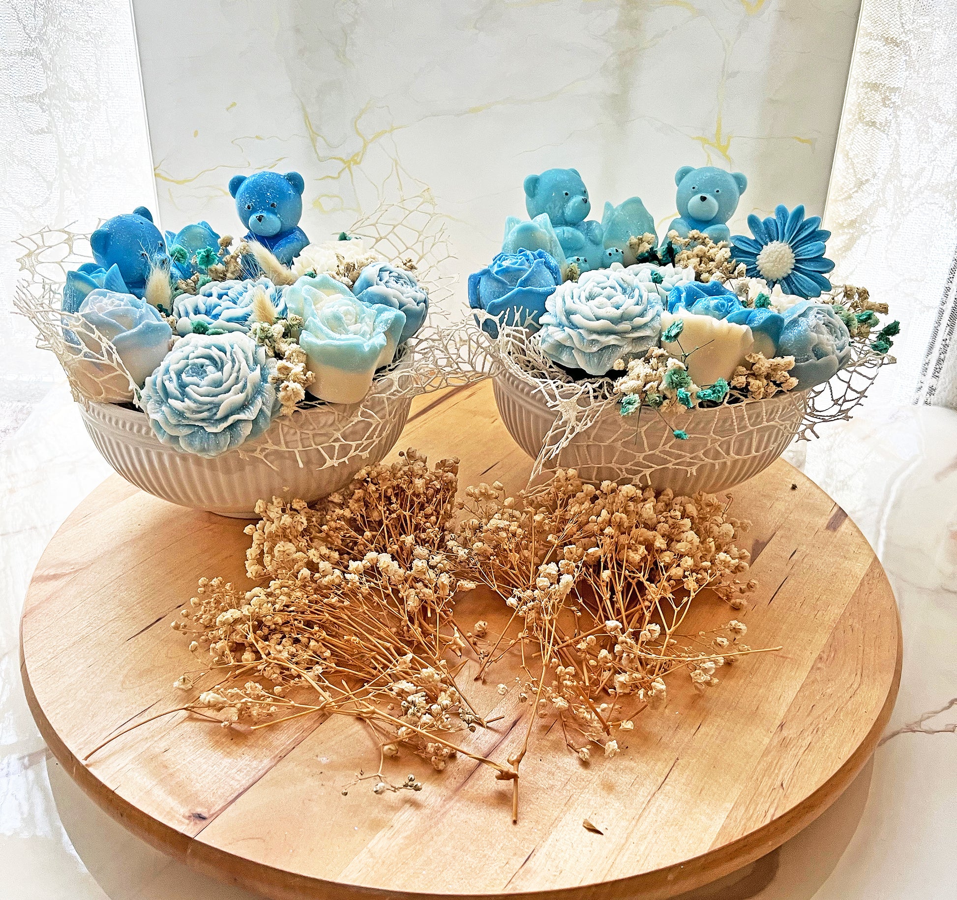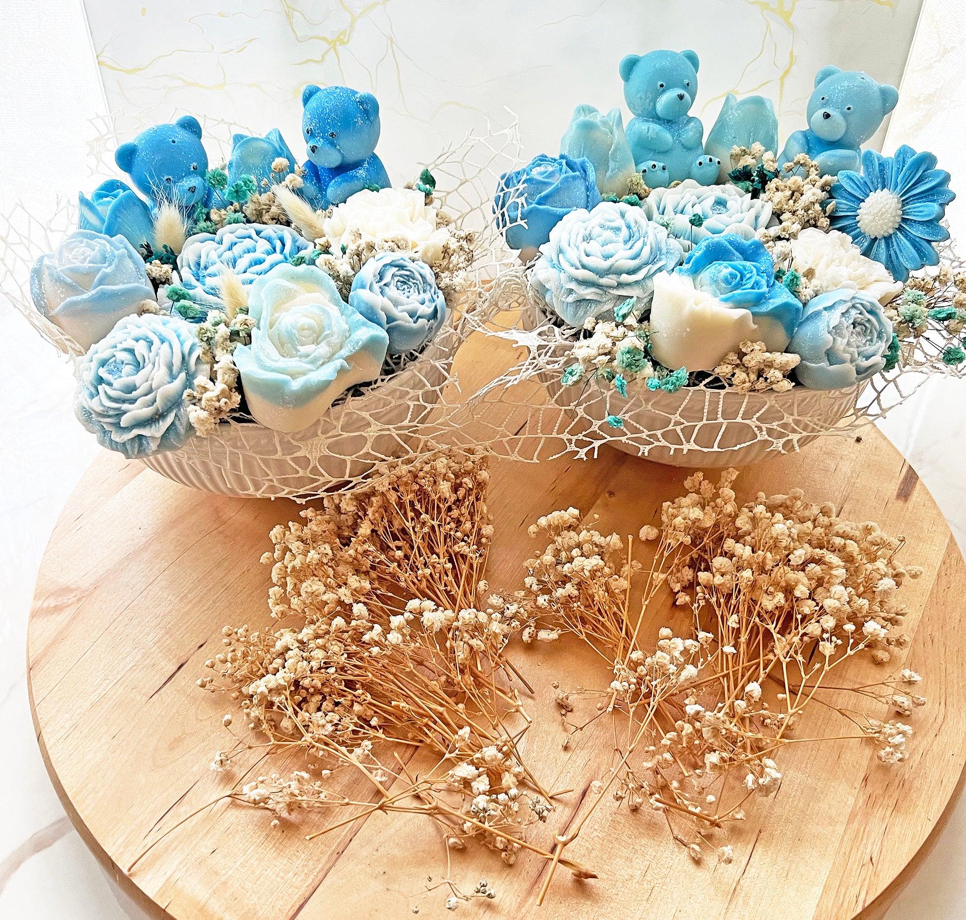 Μια premium, χειροποίητη αρωματική κέρινη σύνθεση σε αποχρώσεις γαλάζιου & λευκού, με τρυφερά αρκουδάκια και λουλουδένιες λεπτομέρειες, που δημιουργούν ένα πραγματικά εντυπωσιακό αποτέλεσμα. Η σύνθεση της HarissaLuxury είναι ιδανική επιλογή για δώρο σε νονό/νονά, για baby shower, για νεογέννητο ή για κάθε ξεχωριστή περίσταση που θέλεις να χαρίσεις κάτι μοναδικό και luxury.