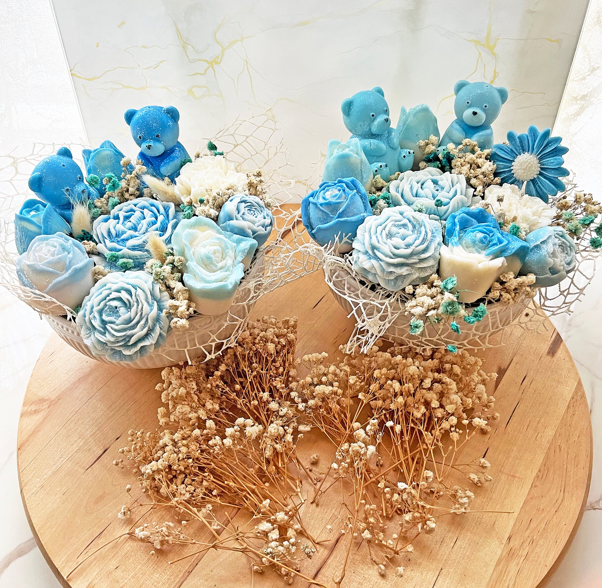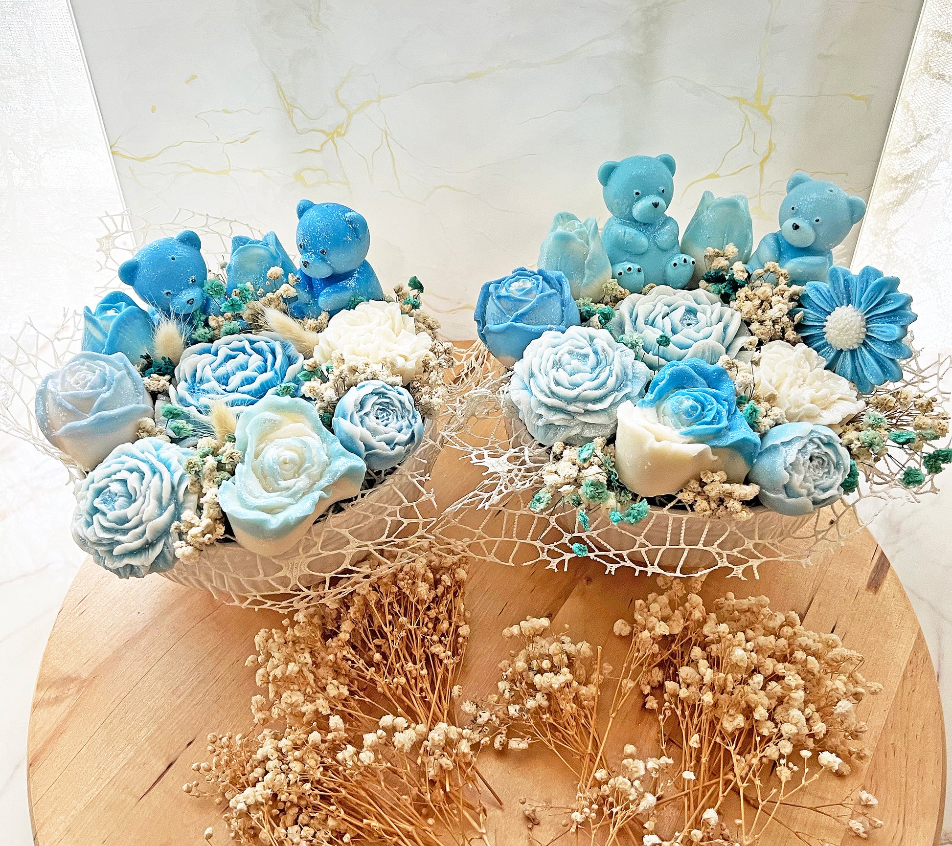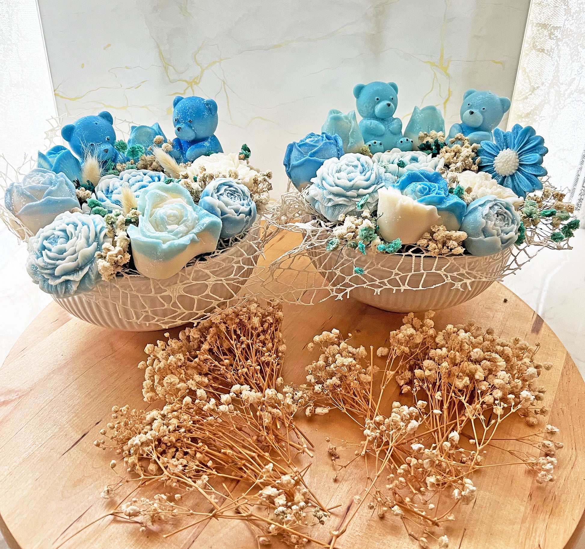 Μια premium, χειροποίητη αρωματική κέρινη σύνθεση σε αποχρώσεις γαλάζιου & λευκού, με τρυφερά αρκουδάκια και λουλουδένιες λεπτομέρειες, που δημιουργούν ένα πραγματικά εντυπωσιακό αποτέλεσμα. Η σύνθεση της HarissaLuxury είναι ιδανική επιλογή για δώρο σε νονό/νονά, για baby shower, για νεογέννητο ή για κάθε ξεχωριστή περίσταση που θέλεις να χαρίσεις κάτι μοναδικό και luxury.