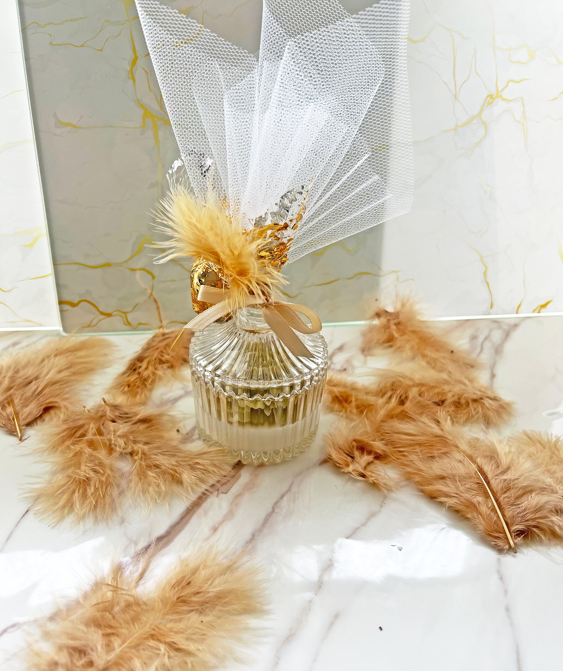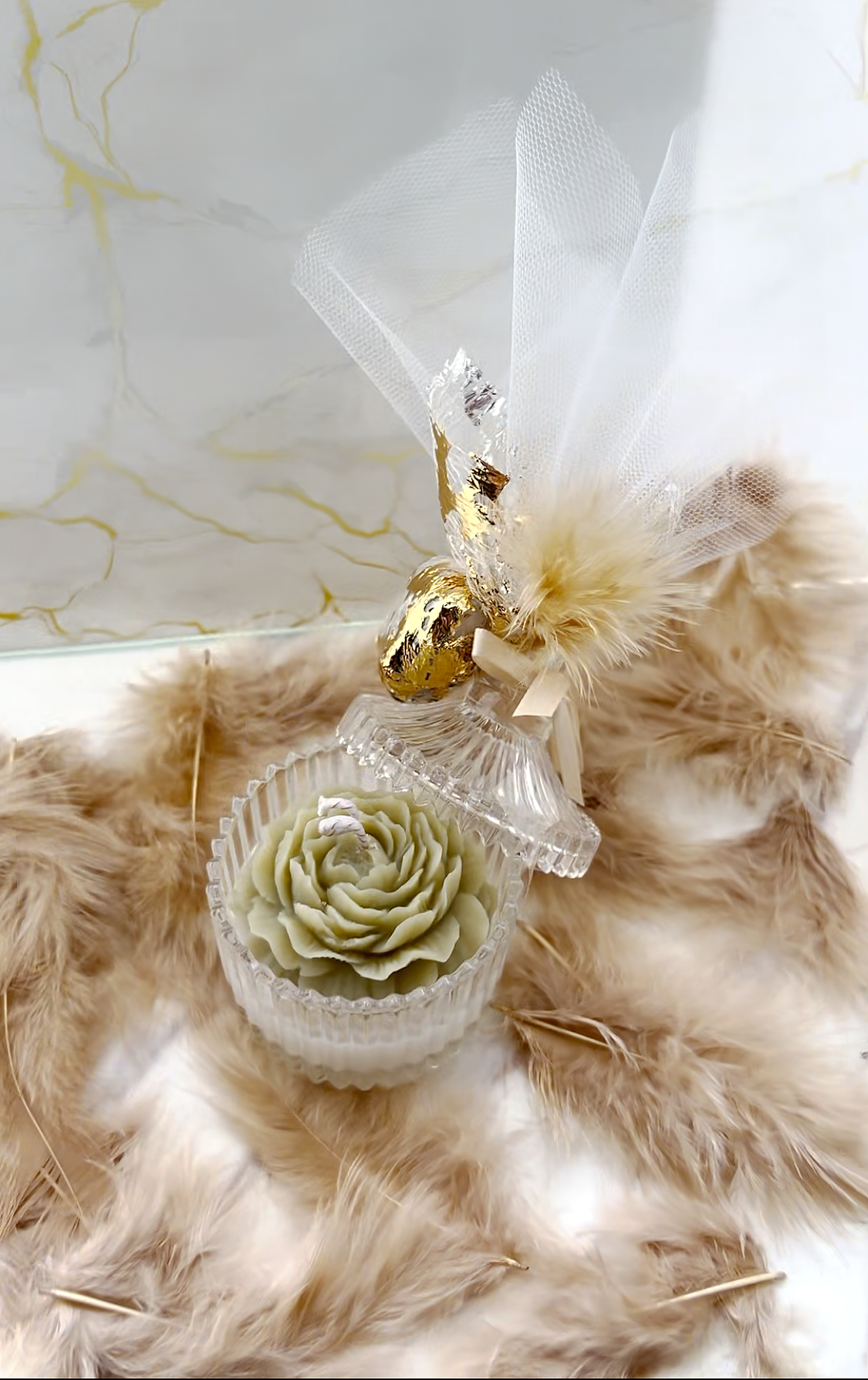 Μια κομψή, χειροποίητη μπομπονιέρα σε μικρή φοντανιέρα, που συνδυάζει την αισθητική της Harissa Luxury με την αίσθηση ενός πραγματικά ξεχωριστού δώρου. Περιλαμβάνει φυτικό κερί σόγιας και ολοκληρώνεται με ένα εντυπωσιακό λουλούδι παιώνια, 35g, στην απόχρωση που επιθυμεί ο πελάτης, δημιουργώντας ένα αποτέλεσμα υψηλής αισθητικής και διακριτικής πολυτέλειας.