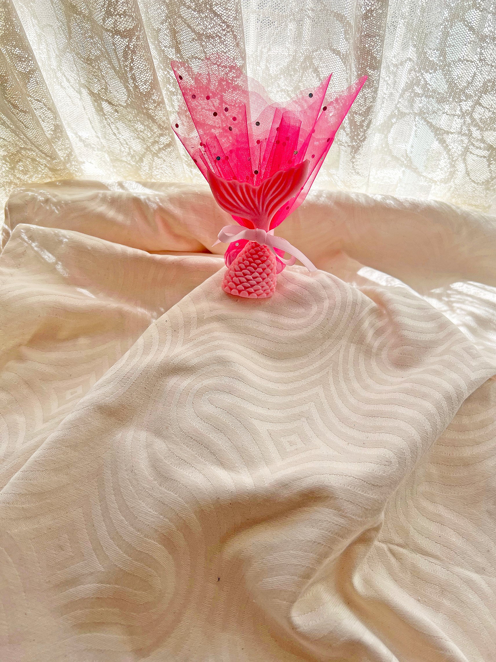 Η παιδική μπομπονιέρα “Γοργονοουρά” είναι μια γλυκιά και παραμυθένια επιλογή, ιδανική για βάπτιση με mermaid θέμα. Με χαριτωμένο σχήμα γοργονοουράς και παιχνιδιάρικο ροζ δέσιμο, χαρίζει στους καλεσμένους σας ένα ξεχωριστό αναμνηστικό που συνδυάζει παιδική χαρά και διακριτική πολυτέλεια.
