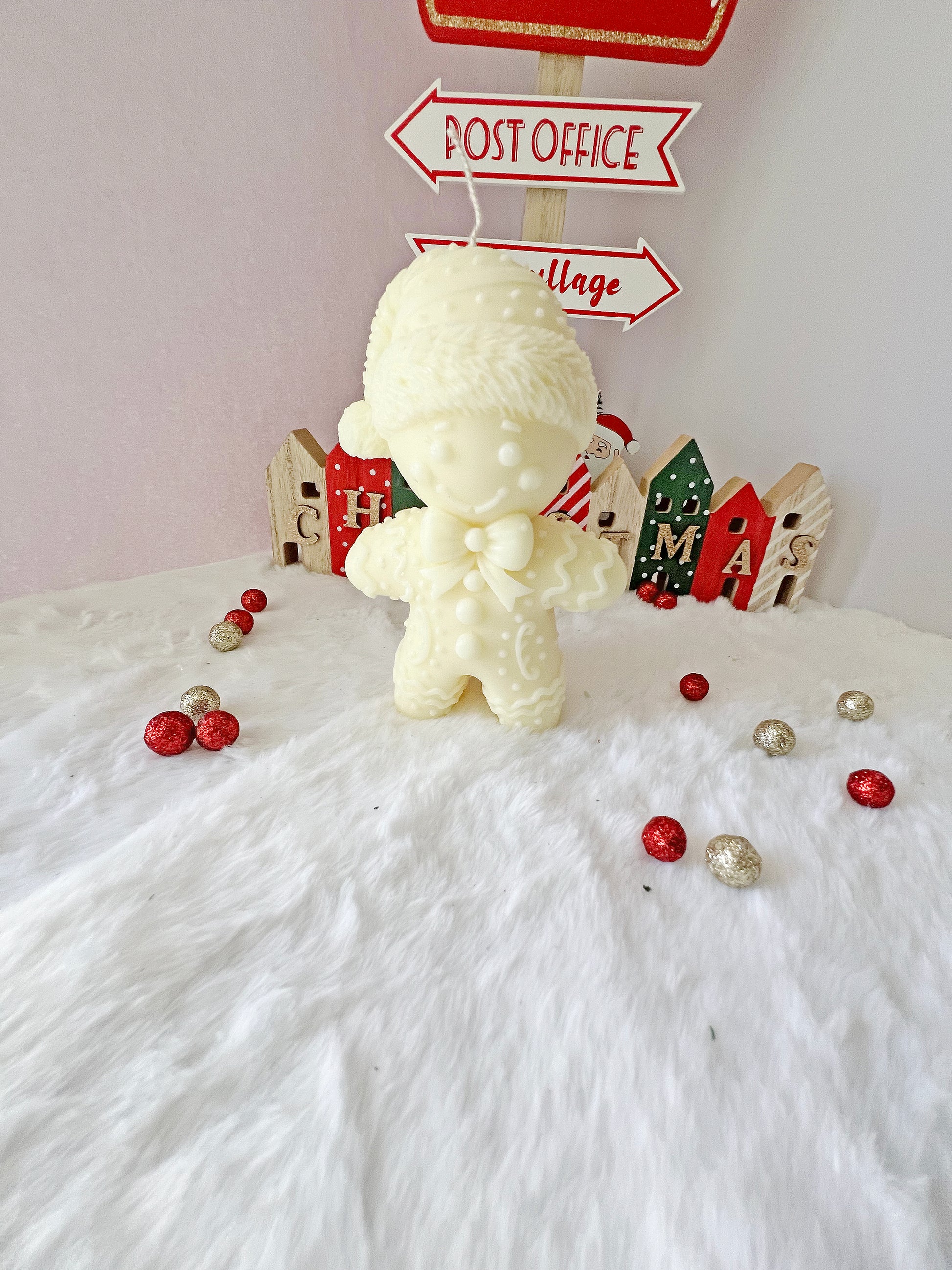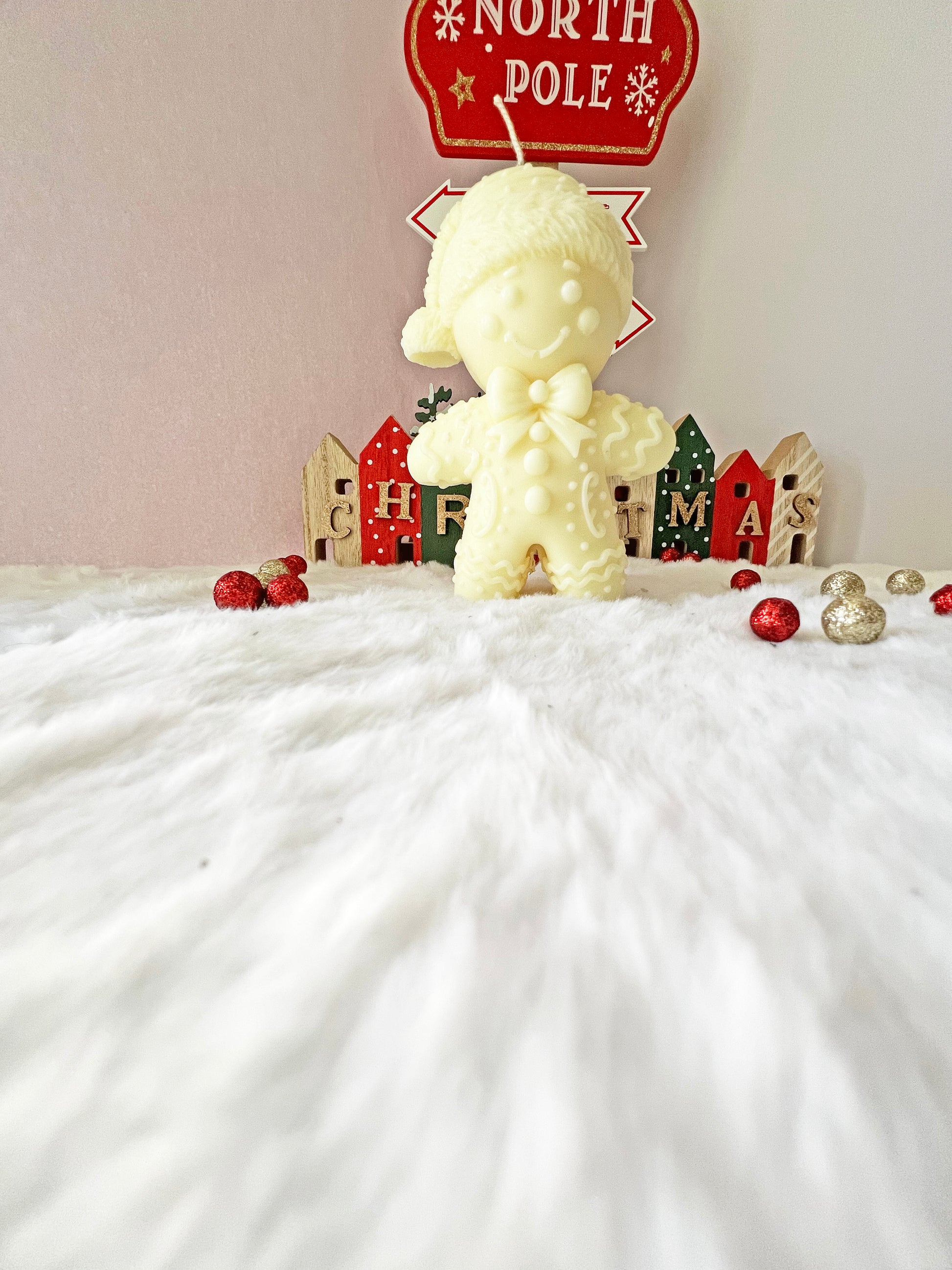 Ο κλασικός χριστουγεννιάτικος τζιντζερμαν αποκτά μια εντυπωσιακή, μεγάλης διάστασης μορφή στο συγκεκριμένο χειροποίητο κερί από 100% φυτικό κερί ελαιοκραμβής . Με το χαμογελαστό του πρόσωπο, τις ανάγλυφες λεπτομέρειες και την «ζεστή» χειμωνιάτικη εμφάνιση, γίνεται κεντρικό το κεντρικό στοιχείο σε κάθε γιορτινή διακόσμηση.