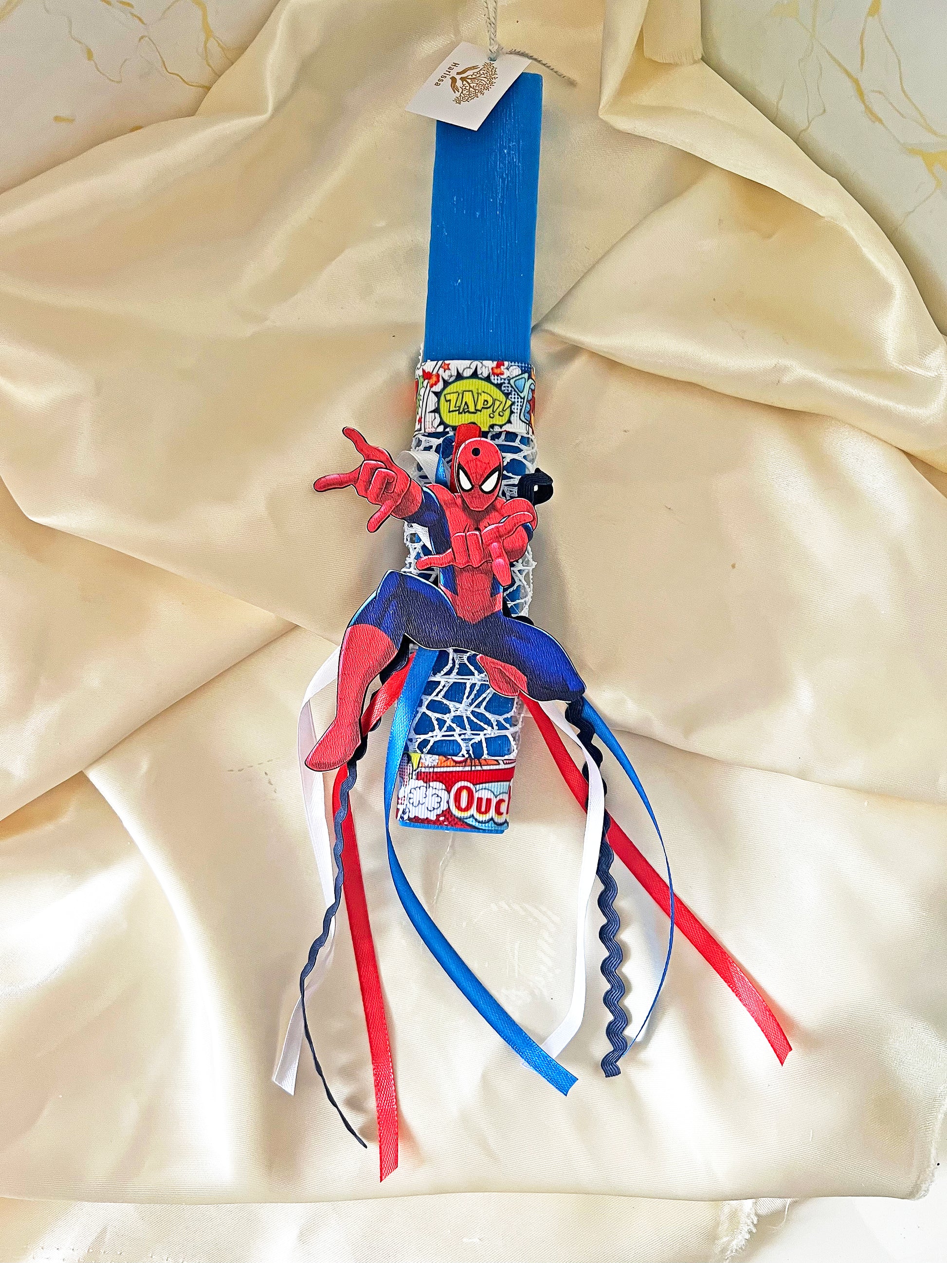Η Spiderman Πασχαλινή Λαμπάδα 2026 της HarissaLuxury είναι η ιδανική επιλογή για μικρούς ήρωες που αγαπούν τη δράση και την περιπέτεια. Με τον εμβληματικό Spiderman σε δυναμική στάση, σε συνδυασμό με μπλε βάση και θεματικές λεπτομέρειες εμπνευσμένες από τον κόσμο των superheroes, δημιουργεί ένα πασχαλινό δώρο που ξεχωρίζει.